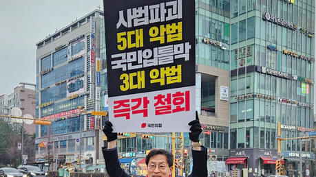 성남시의회 박종각 의원(국민의힘)이 "사법파괴 5대 악법, 국민입틀막 3대 악법 즉각 철회하라!"는 피켓을 들고 1인 시위에 나섰다. 박 의원은 16일 아침 출근길 송현초교사거리에서 피켓 시위를 진행하며 현재 국회에서 논의 중인 일련의 법안들에 대한 강력한 반대 입장을 표명했다. 박 의원이 문제 삼은 '사법파괴 5대 악법'은 ▲내란특별재판부 설치 ▲법왜곡죄 신설 ▲대법관 증원 및 법원행정처 폐지 ▲4심제(재판소원제) 도입 ▲공수처 수사 대상 확대 등이다. '국민입틀막 3대 악법'으로는 ▲정당 현수막 규제법 ▲유튜브 징벌적 손해배상제 ▲필리버스터 제한법을 지목했다. 박종각 의원은 누구? 박종각 의원은 현재 성남시의회에서 활동 중인 국민의힘 소속 의원이다. 평소 시민의 목소리를 대변하고 지역 현안 해결에 적극적으로 나서는 의정 활동으로 주목받아왔다. 박 의원은 지역 주민들의 삶의 질 향상을 위한 다양한 정책 제안과 함께, 시정 감시 활동을 통해 행정의 투명성 제고에도 힘써왔다. 특히 주민과의 소통을 중시하는 현장형 의원으로 평가받고 있다. "삼권분립 수호, 민주주의의 근간" 박 의원은 1인 시위 현장에서 "권력이 남용되지 않도록, 권력이 권력을 저지해야 한다는