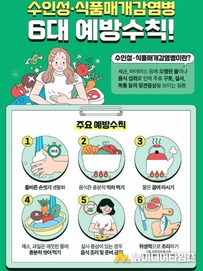 또한, 노로바이러스와 같은 수인성‧식품매개 감염병은 개인위생 준수와 식품 조리 시 위생적인 조리를 통해서 예방할 수 있다. 예방수칙으로는 ▲흐르는 물에 30초 이상 비누로 손씻기 ▲음식은 충분히 익혀 먹기 ▲ 채소, 과일은 깨끗한 물에 씻거나 껍질 벗겨 먹기 ▲ 설사 증상이 있는 경우 음식 조리 및 준비하지 않기 등이 있다.