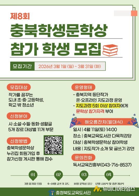 노재경 교육도서관장은 “충북학생문학상을 통해 학생들이 자신의 생각과 감정을 글로 표현하며 창작의 즐거움을 경험하고, 미래 문학 인재로 성장하는 계기가 되길 바란다.”라고 밝혔다.