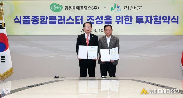 충북 괴산군은 10일 서울 여의도 중기중앙회에서 송인헌 군수, 김석원 맑은물에홀딩스(주) 대표이사 등이 참석해 지역 경제 활성화 및 일자리 창출을 위한 식품종합클러스터 조성 투자협약을 체결했다고 밝혔다.