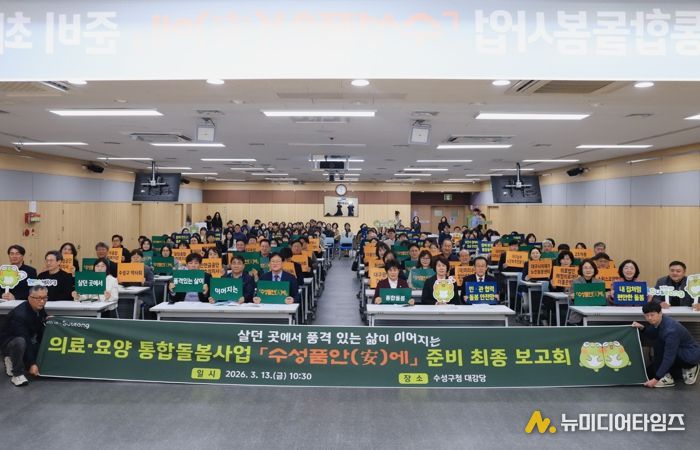 대구 수성구는 지난 13일 구청 대강당에서 이달 27일 시행 예정인 의료·요양 통합돌봄 사업 '수성품안(安)에'의 준비 상황을 점검하고 민관 협력체계를 강화하기 위한 ‘'수성품안(安)에' 준비 최종 보고회’를 개최했다.