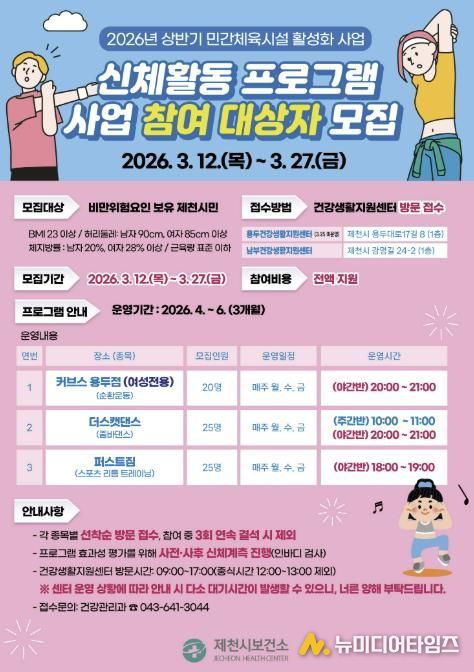 제천시보건소는 비만을 예방하고 규칙적인 운동 습관을 형성하기 위한 민간체육시설 연계 신체활동 프로그램 참여자를 오는 27일까지 모집한다.