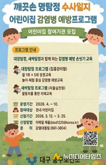 대구 중구보건소(소장 황석선)는 영유아의 올바른 손씻기 습관 형성과 감염병 예방 인식 향상을 위해 어린이집 대상 교육 프로그램 ‘깨끗손 명탐정 세균 수사일지’를 운영한다.