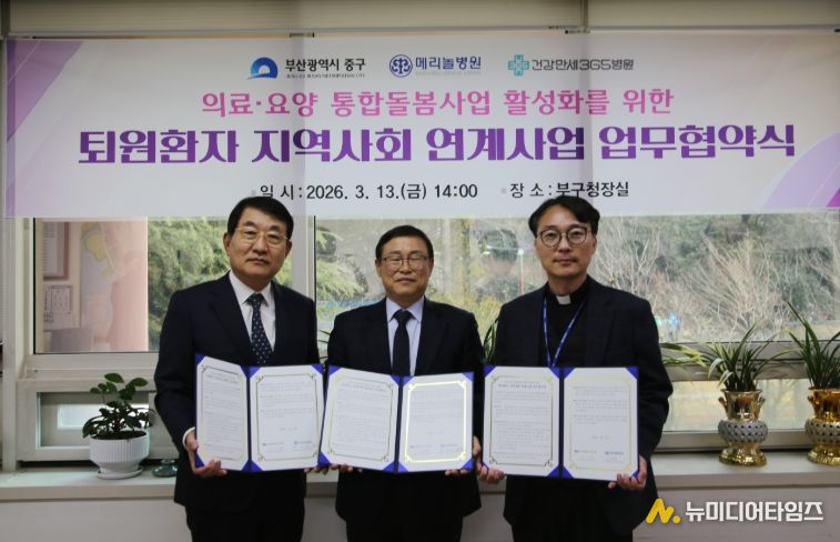 부산 중구는 지난 13일 의료·요양 통합돌봄사업 본격 시행을 앞두고 지역 의료기관(메리놀병원, 건강만세365병원)과'퇴원환자 지역사회 연계사업 업무협약'을 체결했다.