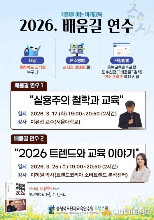 연수는 올해 총 10회에 걸쳐 교육 트렌드, 미래교육, 인문학 등 다양한 주제로 운영되며 충북교육청 소속 교직원 누구나 충북교육연수포털에서 '배움길'을 검색해 연수 시작 3일 전까지 신청해 참여할 수 있다.