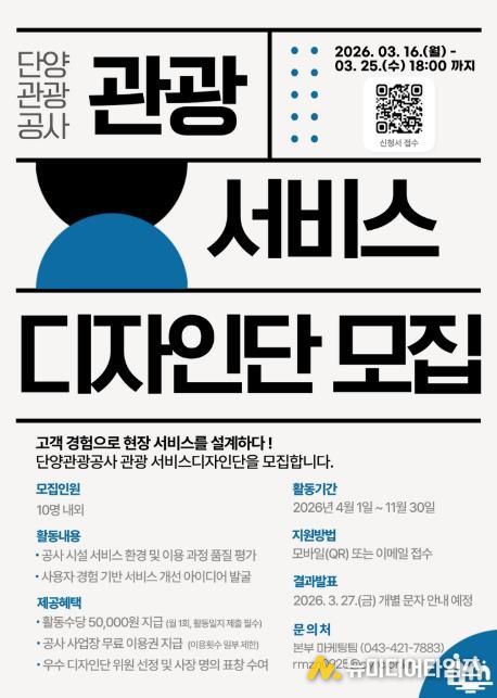 모집 기간은 3월 16일부터 3월 25일까지이며, 단양관광공사 관광시설 이용 경험이 있거나 관심이 있는 사람이라면 누구나 지원할 수 있다. 선발 인원은 최대 10명으로 모바일(QR) 또는 이메일로 접수할 수 있다.