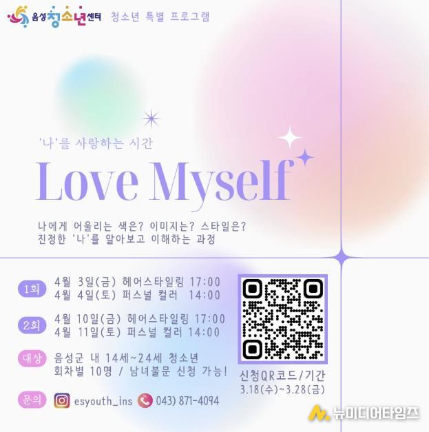 음성청소년센터가 지역 청소년들이 자신에게 어울리는 스타일을 찾고 진정한 자아를 이해할 수 있도록 돕는 특별 프로그램 ‘Love Myself(나를 사랑하는 시간)’ 참가자를 모집한다.