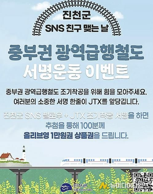 충북 진천군이 ‘중부권 광역급행철도(JTX)’ 조기 착공을 위한 군민과 국민의 관심을 모으기 위해 오는 3월 29일까지 SNS 서명운동 참여 이벤트를 진행한다.