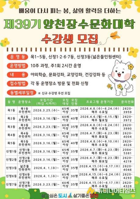 이번 제39기 장수문화대학은 4월 6일부터 6월 24일까지 목1~5동, 신정1·2·6·7동, 신정3동 넓은들민원센터 등 10개 동에서 동별 9주 과정으로 운영된다. 이후 전체 수강생이 함께하는 통합 수료식으로 마무리될 예정이다.