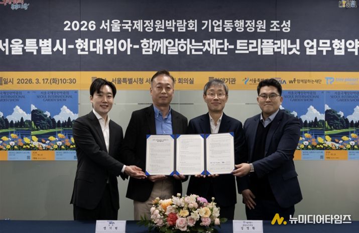 서울시는 현대위아, 함께일하는재단, 트리플래닛과 5월 1일 개막하는 ‘2026 서울국제정원박람회’의 기업동행정원 업무협약(MOU)을 3월 17일 서울시청에서 체결했다.