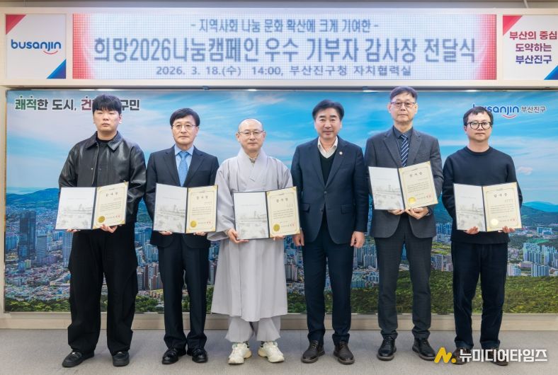 부산진구는 3월 18일‘희망2026 나눔캠페인 우수기부자 감사장 전달식’을 개최하고, 캠페인 기간 이웃사랑을 실천한 우수 기부자에게 감사장을 전달했다고 밝혔다.