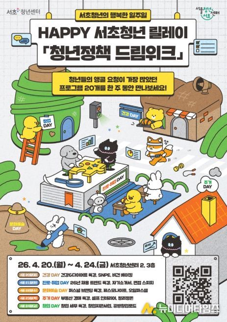 서울 서초구는 청년들이 다양한 정책과 프로그램을 직접 체험하며 정보를 얻을 수 있는 ‘2026 HAPPY 서초청년 릴레이 : 청년정책 드림위크’를 오는 4월 20일(월)부터 24일(금)까지 5일간 서초청년센터에서 개최한다고 밝혔다.