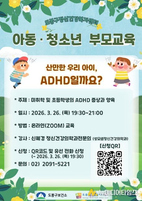 서울 도봉구가 오는 3월 26일 오후 7시 30분에 아동·청소년기 대표 정신질환인 주의력결핍 과잉행동장애(ADHD)에 대한 부모 교육을 실시한다.