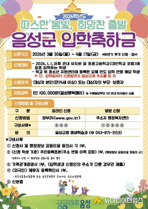 음성군은 올해 2026학년도 입학을 맞아 관내 유치원과 초·중·고등학교 입학생, 그리고 학교 밖 청소년지원센터에 등록된 입학 연령에 해당되는 청소년을 대상으로 입학축하금을 지원한다고 밝혔다.