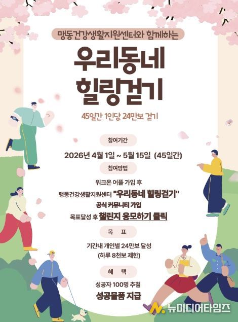 충북 음성군 맹동건강생활지원센터는 주민들의 걷기 실천율을 높이고 비만, 우울, 고혈압 등 기저질환 관리를 돕기 위해 오는 4월부터 ‘우리동네 힐링걷기’ 챌린지를 운영한다.
