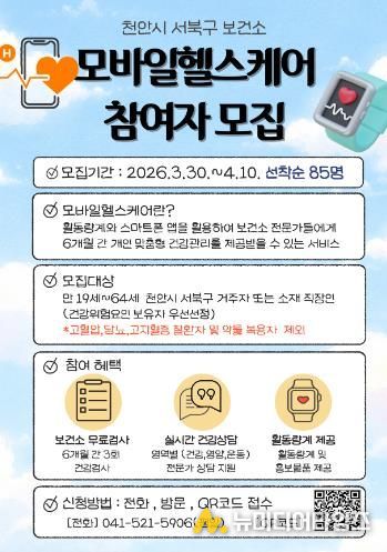 천안시 서북구보건소는 오는 30일부터 ‘모바일 헬스케어’ 사업 참여자를 모집한다고 25일 밝혔다.