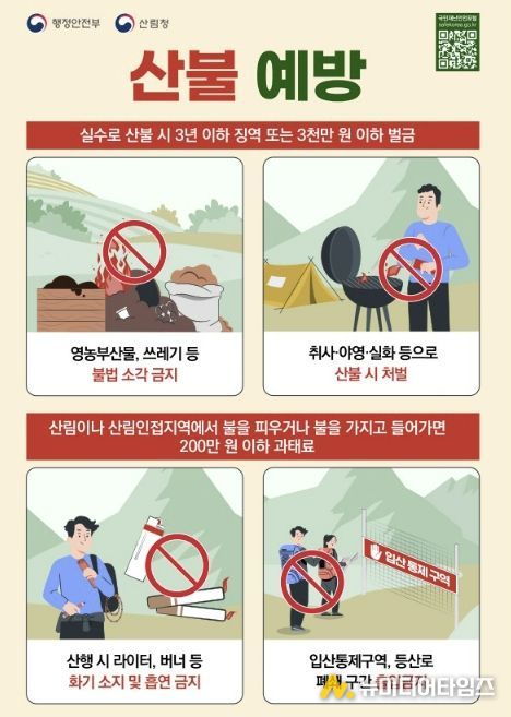 군 관계자는 “산불 발생 시 고의나 과실 여부와 관계없이 엄중 처벌되며, 과실로 산림을 훼손할 경우 3년 이하의 징역 또는 3천만 원 이하의 벌금이 부과될 수 있다”며 “소중한 산림을 지키기 위한 군민들의 적극적인 협조를 부탁드린다”고 말했다.