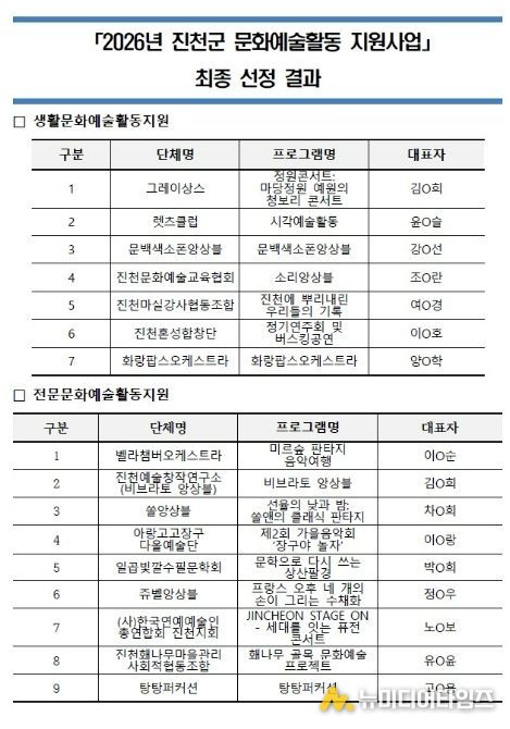 이번 사업은 총 5천800만 원 규모로 운영되며, 선정된 단체들은 사업 유형과 규모에 따라 활동비를 지원받아 오는 4월부터 11월까지 진천군 전역에서 공연, 전시, 교육 등 다양한 문화예술 프로그램을 선보일 예정이다.