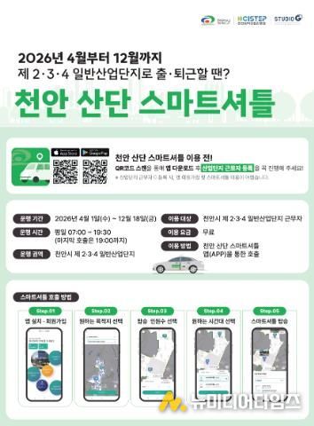 서비스는 평일 오전 7시부터 오후 7시 30분까지 제공되며, 산업단지 근로자라면 누구나 ‘천안 산단 스마트셔틀’ 앱을 통해 무료로 차량을 호출해 이용할 수 있다.