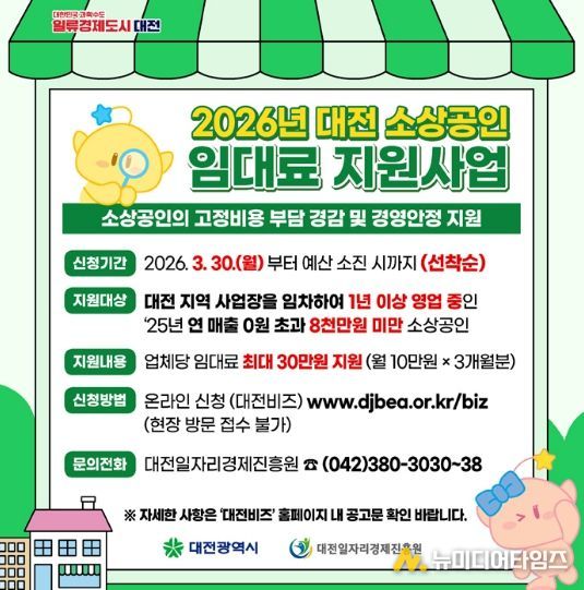 한편 대전시는 2024년부터 전국 최대 규모의 소상공인 임대료 지원사업을 지속적으로 추진해 왔으며, 지난해까지 누적 약 1만 9천 개소의 소상공인이 지원을 받았다.