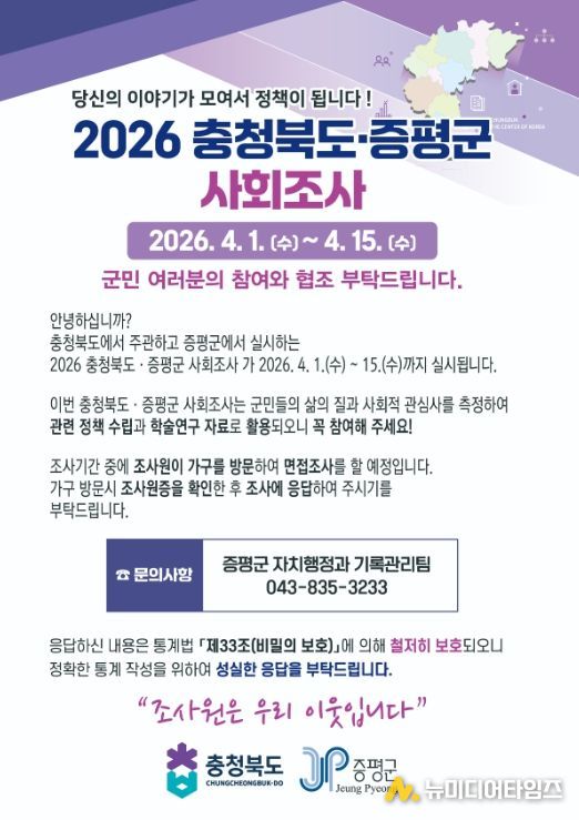 충북 증평군은 오는 4월 1일부터 15일까지 군민의 생생한 목소리를 담아내는‘2026 사회조사’를 실시한다고 밝혔다.