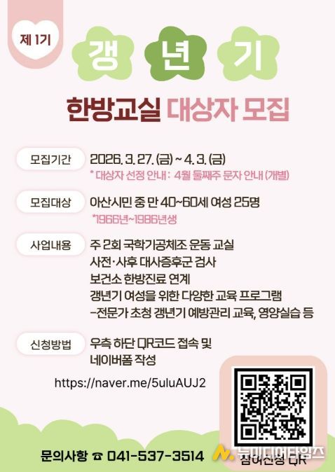 모집 대상은 아산시에 거주하는 만 40세부터 60세(1966년~1986년생)까지의 여성으로, 참여 신청은 QR코드 접속 또는 네이버폼을 통해 가능하다.