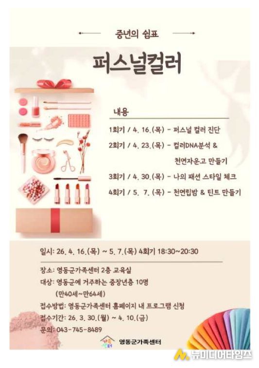 충북 영동군가족센터가 중장년층의 자기 이해와 삶의 활력 증진을 위해 ‘중년의 쉼표–퍼스널컬러 프로그램’을 운영한다.