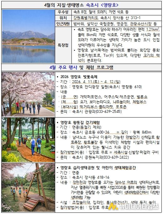 강원특별자치도는 2026년 4월 ‘지질·생태명소’로 속초시 '영랑호'를 선정했다고 밝혔다.