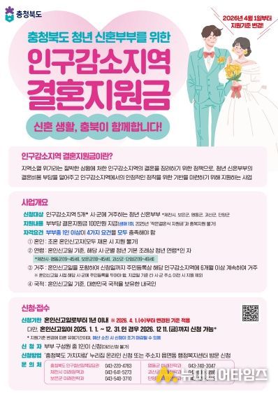 충북도는 도내 인구감소지역 청년 신혼부부의 안정적인 지역 정착을 지원하기 위해 추진 중인 ‘인구감소지역 결혼지원금’ 사업을 오는 4월 1일부터 전격 개편 시행한다.