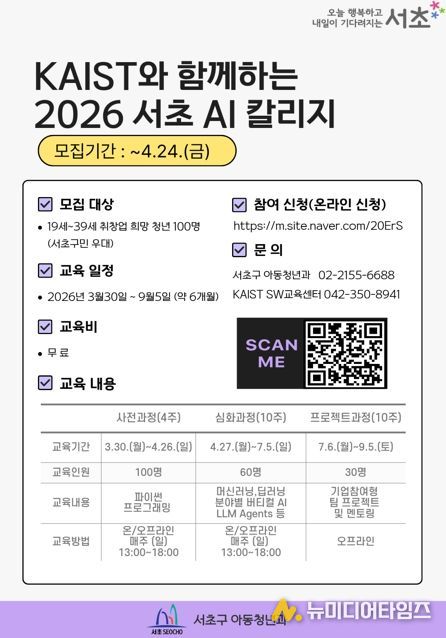 이번 교육은 19세에서 39세의 취업준비 청년 100명을 모집하며, 신청은 4월 24일까지 서초구청 누리집을 통해 가능하다. 앞서 구는 지난 20일 온·오프라인으로 ‘서초 AI 칼리지’ 사전설명회를 열어 교육 과정과 지원 방법을 안내한 바 있다.