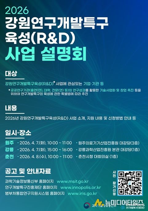 연구개발특구진흥재단과 강원특별자치도는 ‘2026년 강원연구개발특구육성(R·D) 사업 설명회’를 4월 7일 원주·강릉, 8일 춘천에서 개최한다고 밝혔다.