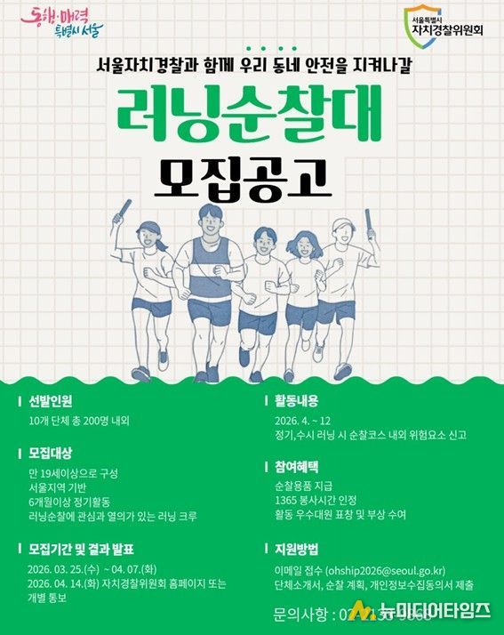 서울시 자치경찰위원회는 러닝을 하며 동네 안전까지 함께 살피는 시민 참여형 활동인 서울 러닝 순찰대에 참여할 2026년 신규 대원을 모집한다. 올해는 10개 단체(크루) 200명 규모로 확대해 운영할 계획이다.
