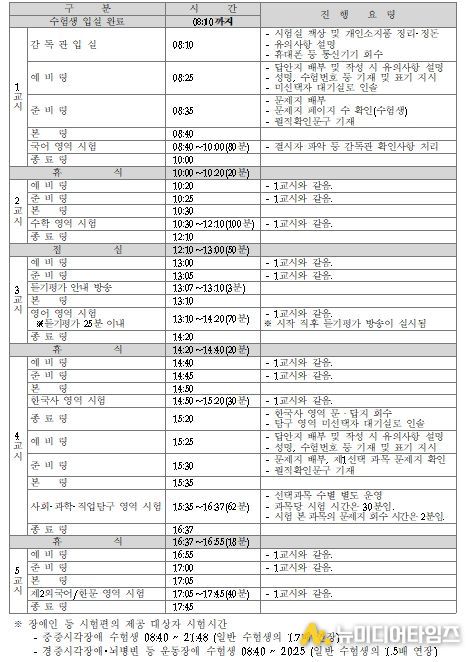 12. 장애인 권익 보호 및 편의 증진을 위하여 점자문제지가 필요한 시각장애 수험생 중 희망자에게는 화면낭독프로그램이 설치된 컴퓨터와 해당 프로그램용 문제지 파일을 제공하고, 이에 더하여 2교시 수학 영역 및 4교시 탐구 영역에서 필산기능을 활용할 수 있는 점자정보단말기를 제공한다.