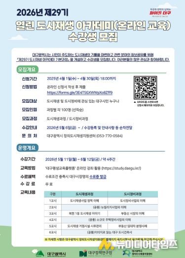 대구광역시는 도시재생과 정비 사업에 대한 시민들의 올바른 이해와 역량 강화를 위해 ‘제29기 열린 도시재생 아카데미 기본과정(온라인교육)’ 수강생을 모집한다.