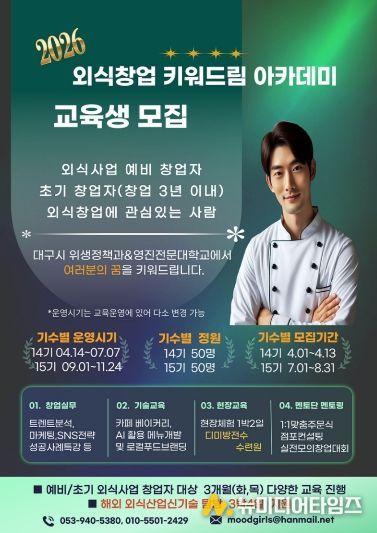노권율 대구광역시 위생정책과장은 “이번 외식창업 ‘키워드림’ 아카데미가 침체된 지역경제에 새로운 활력을 불어넣길 기대한다”며 “내실 있는 교육과정 운영을 통해 실패를 최소화하는 창업 생태계를 조성하고, 대구 외식업계가 지속 가능한 성장을 이어갈 수 있도록 적극 지원하겠다”고 말했다.