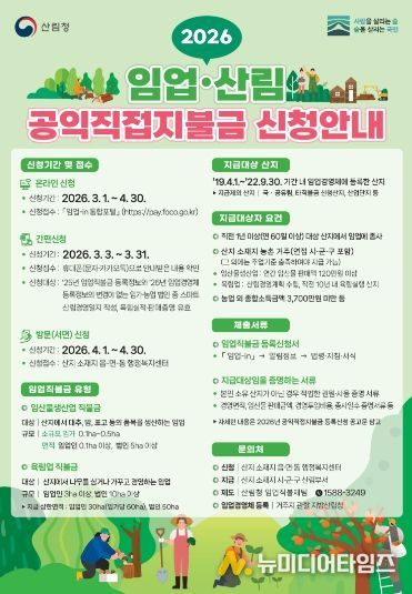 충남도는 오는 30일까지 산지 소재지 읍·면·동 행정복지센터에서 ‘2026년 임업·산림 공익직접지불금’ 신청서를 접수받는다고 1일 밝혔다.