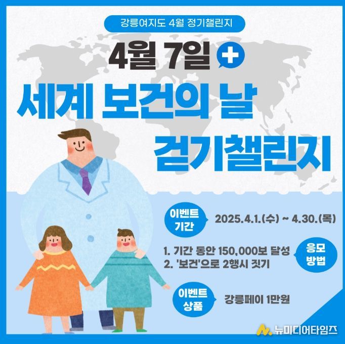강릉시는 4월 7일 보건의 날을 맞아 시민들의 건강생활 실천 분위기 조성을 위해 '보건의 날 기념 걷기챌린지'와 '걷기동아리 명품길 걷기프로그램'을 운영한다.