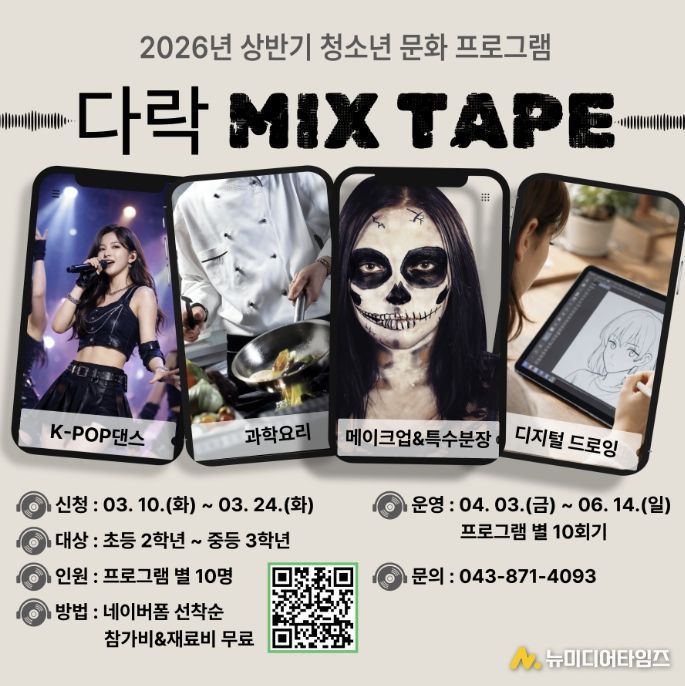 음성청소년센터가 관내 청소년들의 뜨거운 관심 속에 2026년 상반기 청소년 문화 프로그램 ‘다락MIXTAPE’의 운영 준비를 마치고 4월부터 본격적인 일정에 들어간다.