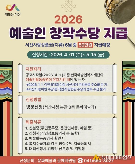 지원 대상은 2026년 1월 1일 이전부터 서산시에 6개월 이상 주민등록을 두고 거주한 전문 예술인으로, 한국예술인복지재단이 발급한 예술활동증명 확인서가 유효해야 한다.