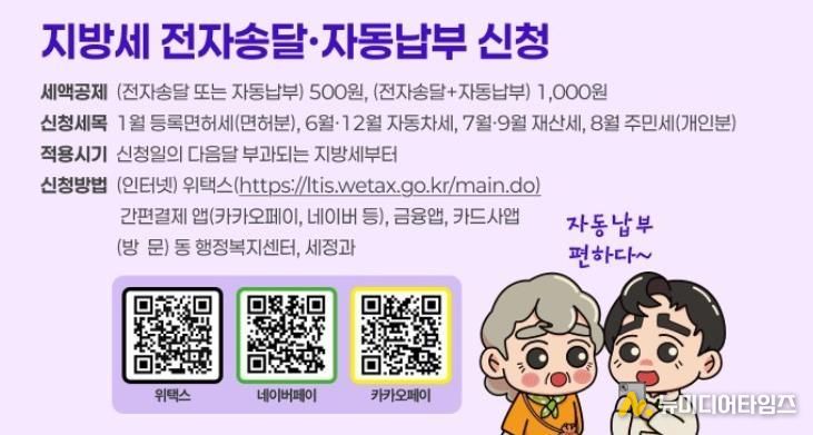 전자송달은 위택스, 간편결제 앱(네이버, 카카오페이 등) 또는 카드사·금융사 앱을 통해 신청할 수 있으며, 자동납부는 위택스에서 온라인으로 신청하거나, 거래 은행 또는 중구청 세정과 및 동 행정복지센터로 직접 방문해 신청할 수 있다.