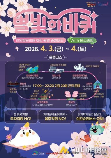 천안시가 벚꽃 개화기에 맞춰 도심의 야경과 봄꽃 명소를 한 번에 즐길 수 있는 야간 관광 순환버스 프로그램 ‘별빛 한 바퀴’를 선보인다.