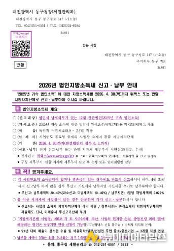 대전 동구는 법인세 납세의무가 있는 12월 결산법인을 대상으로 오는 30일까지 법인지방소득세 집중 신고기간을 운영한다고 1일 밝혔다.