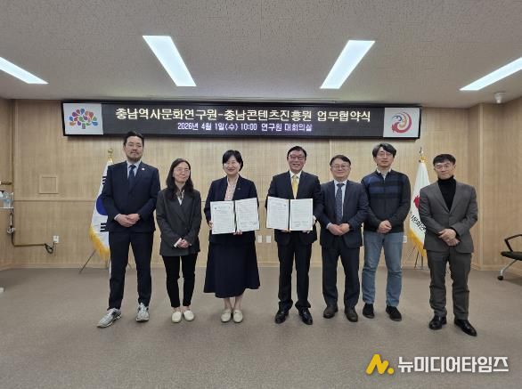 이날 양 기관은 협약에 따라 ▲충남 역사·문화 콘텐츠 공동 기획 및 제작·유통 ▲관련 교육·세미나·포럼 공동 개최 ▲인적·물적 자원 및 정보 교류 등 다양한 분야에서 긴밀한 협조 체계를 가동하기로 했다.