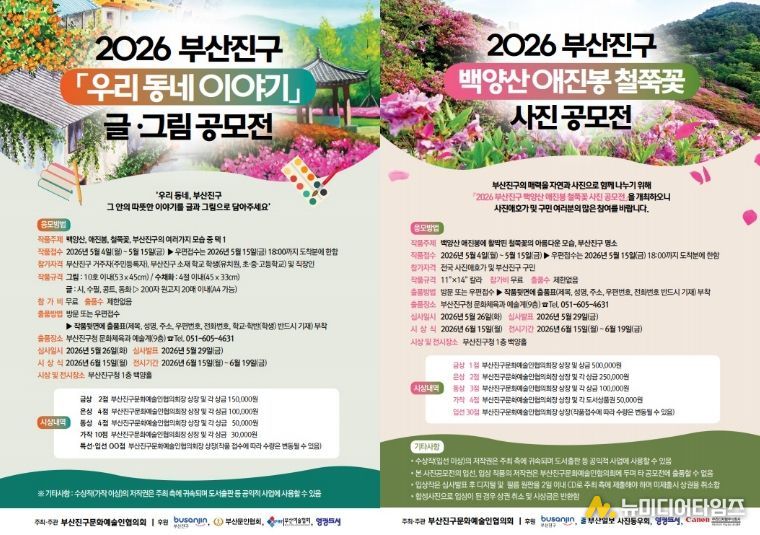 ‘백양산 애진봉 철쭉꽃 사진 공모전’은 전국 사진 애호가와 부산진구 구민을 대상으로 백양산 애진봉에 만개한 철쭉꽃의 아름다움을 담은 작품을 공모한다. 또한‘우리동네 이야기 글·그림 공모전’은 부산진구에 거주하거나 관내 학교에 재학 중인 초·중·고등학생을 대상으로, 부산진구의 다양한 모습을 주제로 한 글과 그림 작품을 자유롭게 출품할 수 있다.
