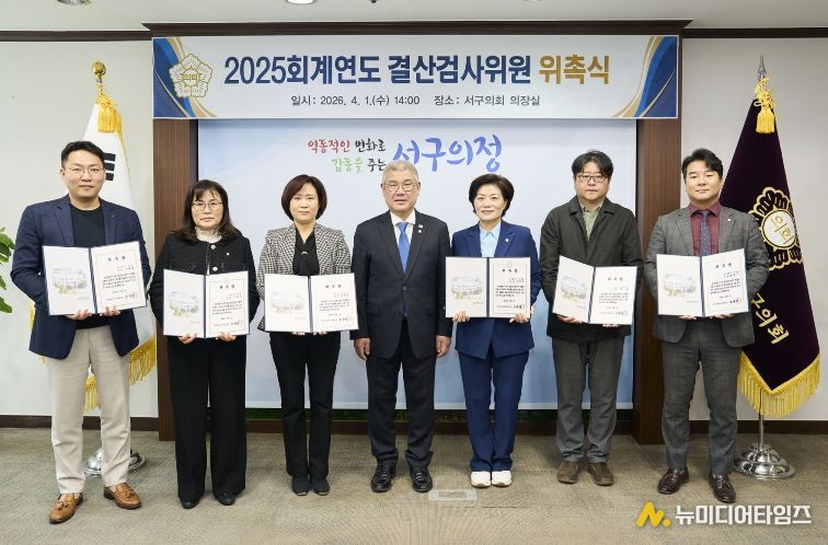 이날 위촉된 결산검사위원은 강정수 의원을 대표위원으로, 신진미 의원, 정승 세무사, 김영찬 세무사, 이순우 세무사, 서현철 세무사 등 총 6명으로 구성됐다. 서구의회는 의원과 민간 전문가가 함께 참여하는 방식으로 결산검사의 전문성과 객관성을 높인다는 방침이다.