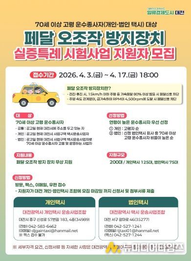 대전시는 고령 운전자의 급발진 교통사고를 예방하기 위해 ‘페달오조작 방지장치 실증특례 시범사업’을 추진하고, 고령의 택시 운전자를 대상으로 지원자를 모집한다.