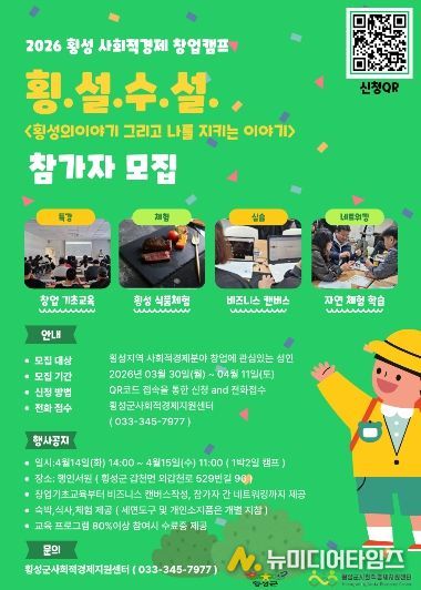 횡성군 사회적경제 지원 센터는 지역 내 사회적경제 활성화와 창업 생태계 조성을 위한 ‘2026 횡성 사회적경제 창업 캠프 '횡.설.수.설.'’ 참가자를 모집 중이라고 4일 밝혔다.
