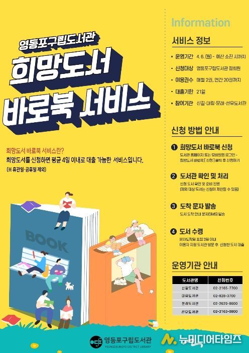 영등포구가 오는 6일부터 희망도서를 평균 4일 안에 빠르게 받아볼 수 있는 ‘희망도서 바로북’ 서비스를 운영한다고 밝혔다.