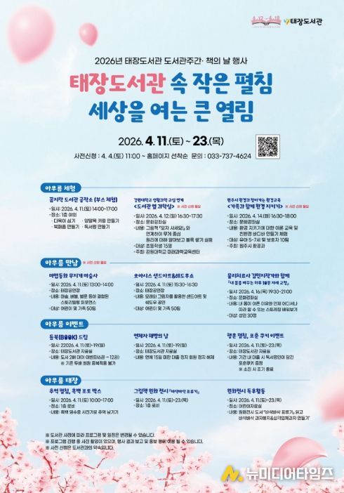 원주시 태장도서관은 도서관 주간 및 책의 날을 맞이해 오는 11일부터 23일까지 ‘태장도서관 속 작은 펼침, 세상을 여는 큰 열림’을 주제로 다양한 행사를 개최한다.