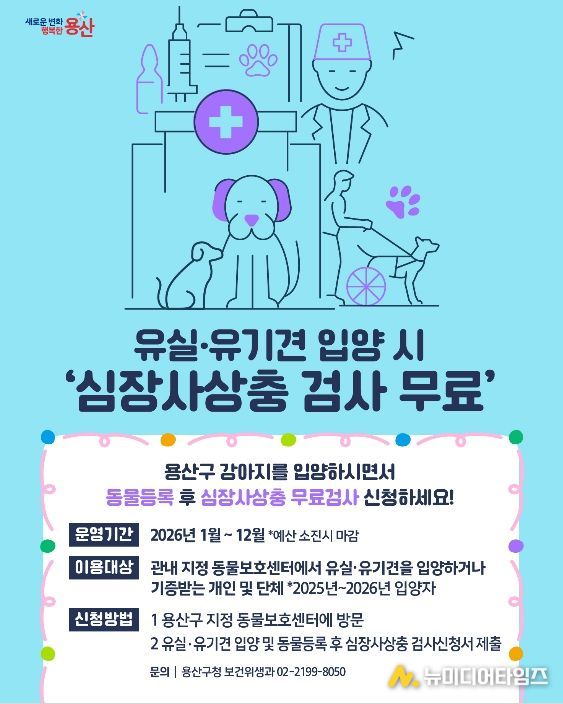 서울 용산구가 유실·유기견 입양 가구를 대상으로 ‘심장사상충 검사비 무료 지원’ 사업을 추진한다. 입양자의 경제적 부담을 덜고 입양을 활성화해, 반려동물 친화도시를 조성하기 위한 취지다.